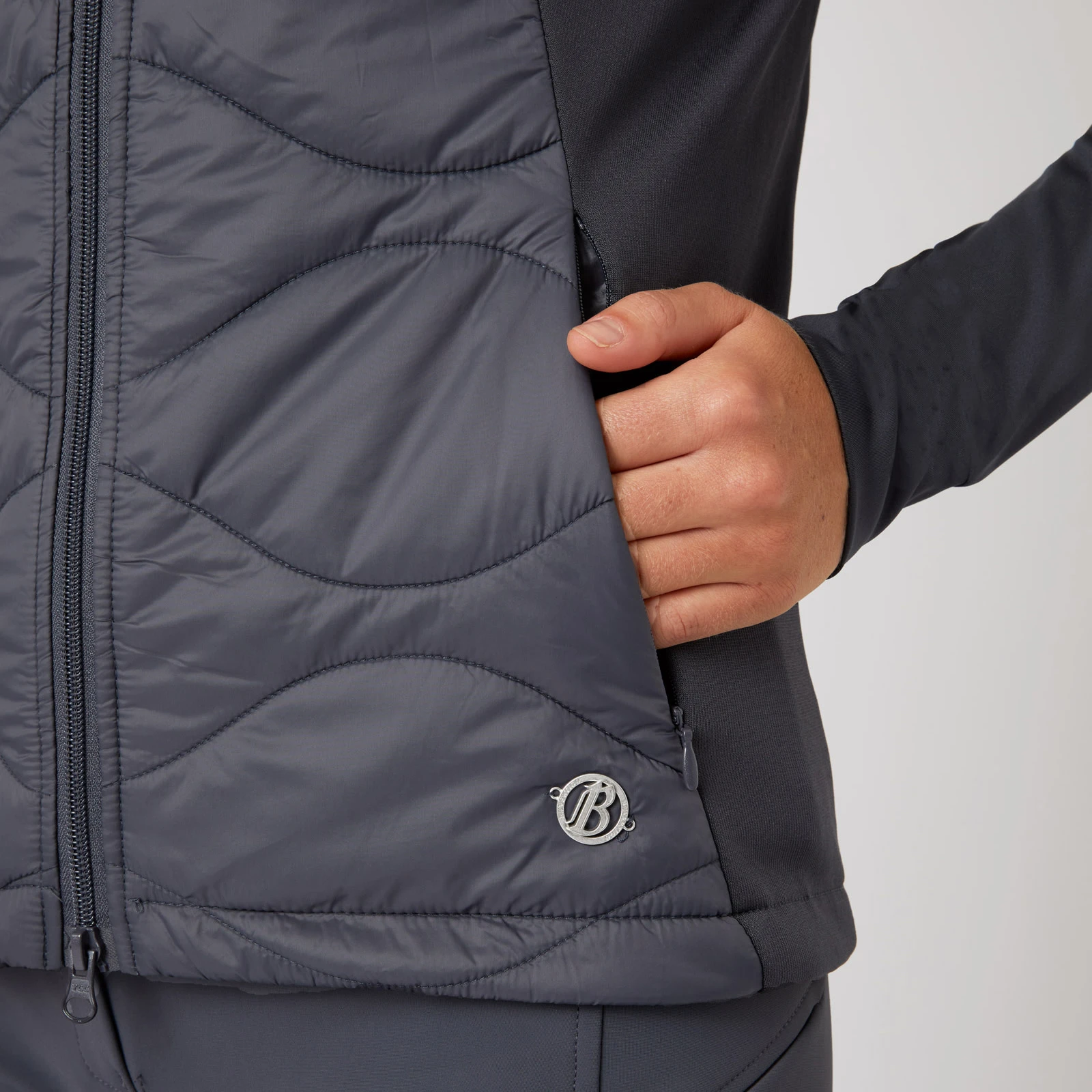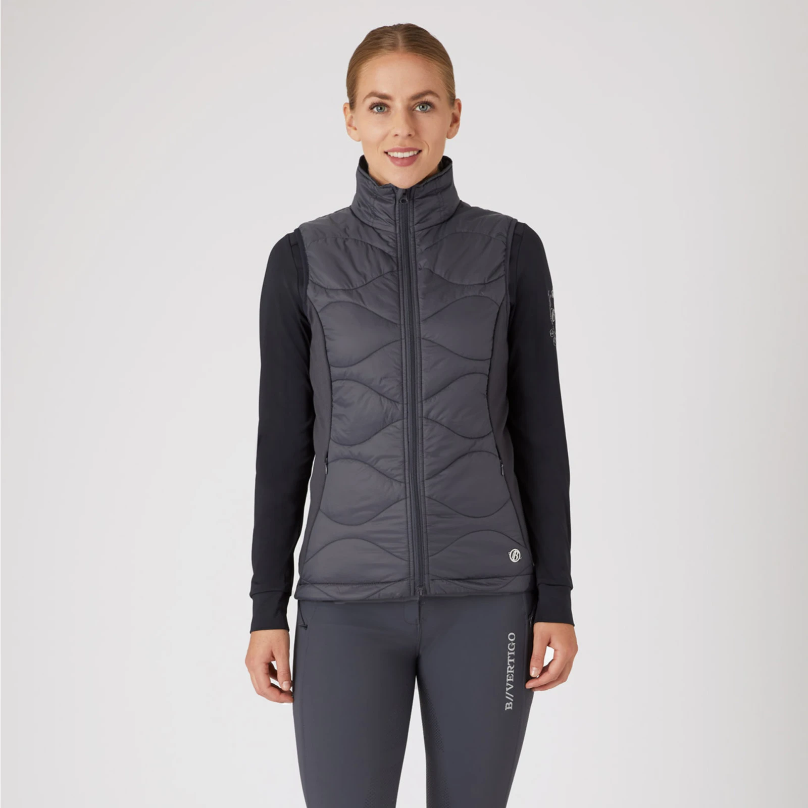 The B Vertigo Belle hybrid vest is made from light material that is warmly padded. Elastic fleece provides additional warmth, while breathable mesh inserts offer ventilation. The hood is attachable with press buttons. Two zipper pockets keep your belongings safe. Neutral colors are easy to incorporate into your riding wardrobe. Elastic hem and cuffs make sure this jacket stays in place. Also available as jacket version (#33625).