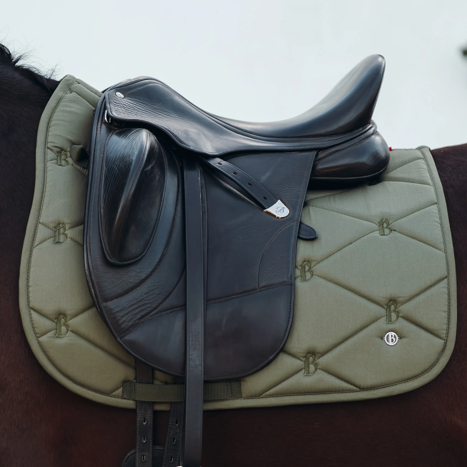 - Metal logo at left corner and rubber badge at withers