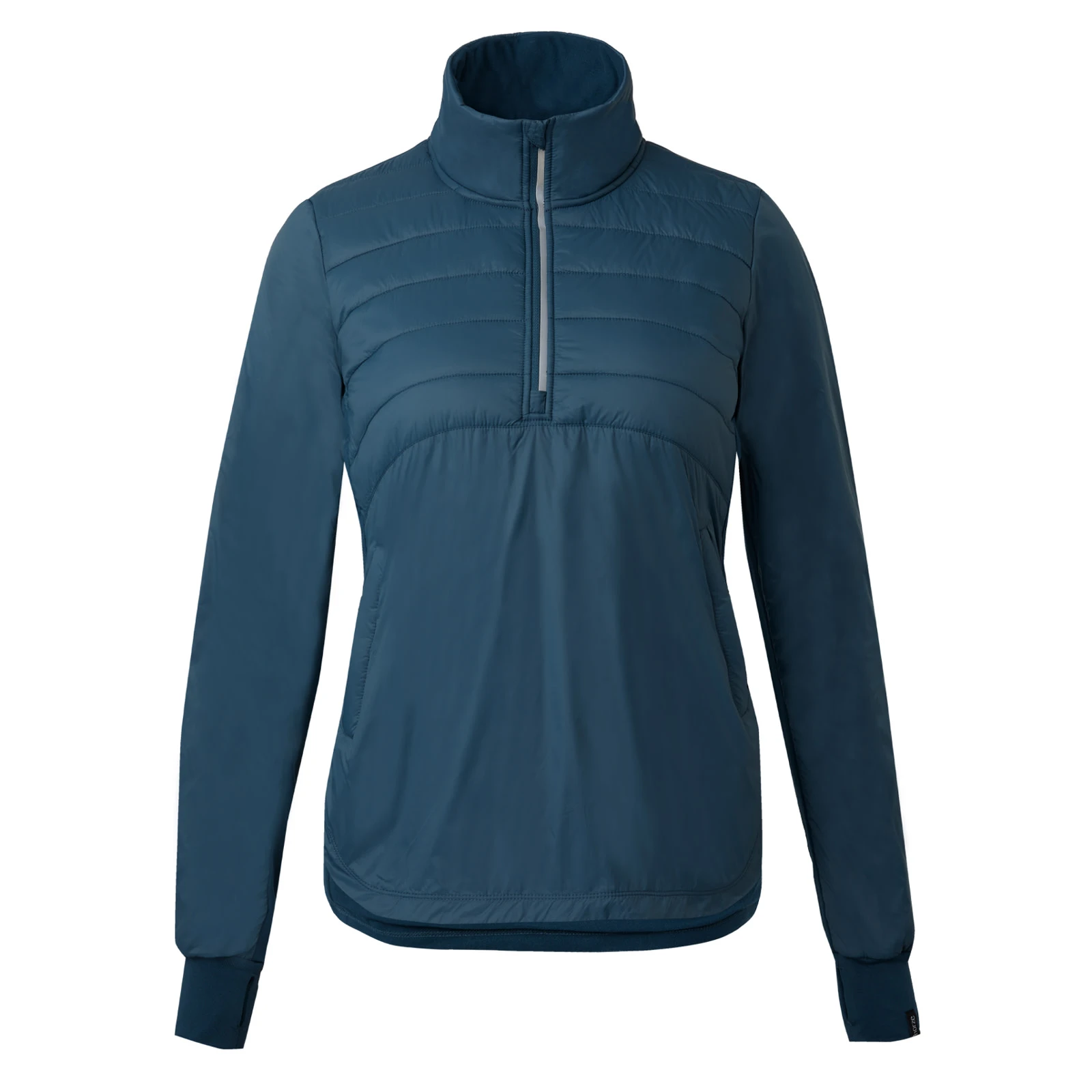 The coat is designed to flatter and comes in several attractive color options. Soft, lightweight technical fleece is combined with windproof woven fabric to create a durable hybrid anorak. The hem is slightly lower at the back for more protection, and the front pockets are closable with zips. The main zip opens halfway down the front – keep it open when warm or close up the high collar to keep your neck warm. A reflective strip runs the length of the zip, and we all know that the more reflective details you can wear in the dark, the better!