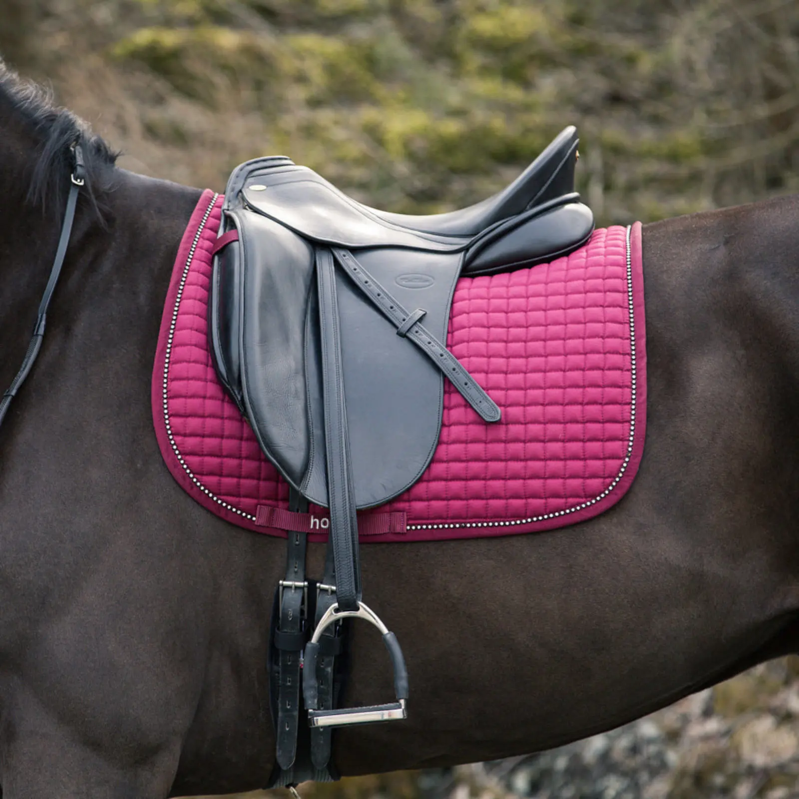 The Horze Duchess Dressage Saddle Pad is made with a small Horze emblem at the girth strap and includes hook-and-loop fasteners to keep the pad in place. A high wither adds comfort and provides a great fit. Moisture-wicking fabric is quilted in a small square check design that gives this dressage saddle pad a classic appearance.