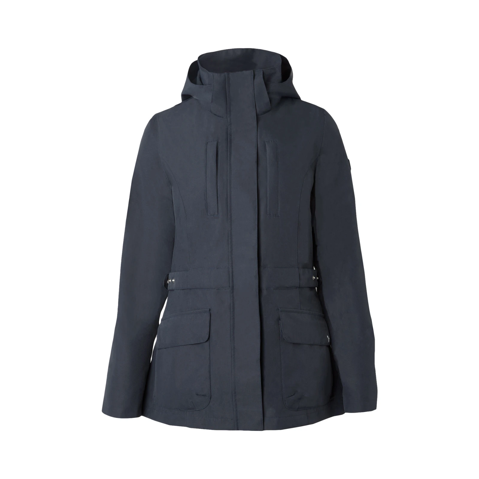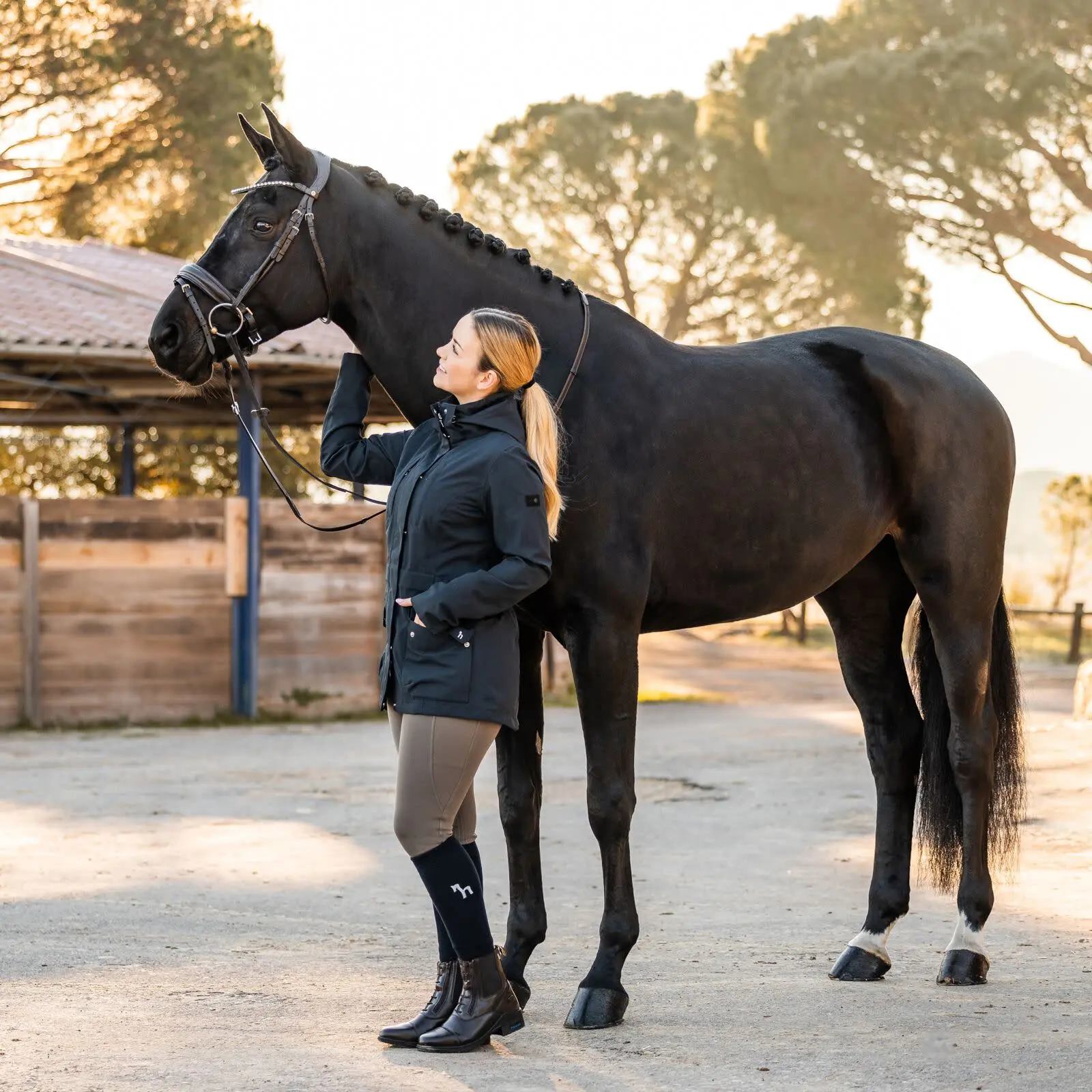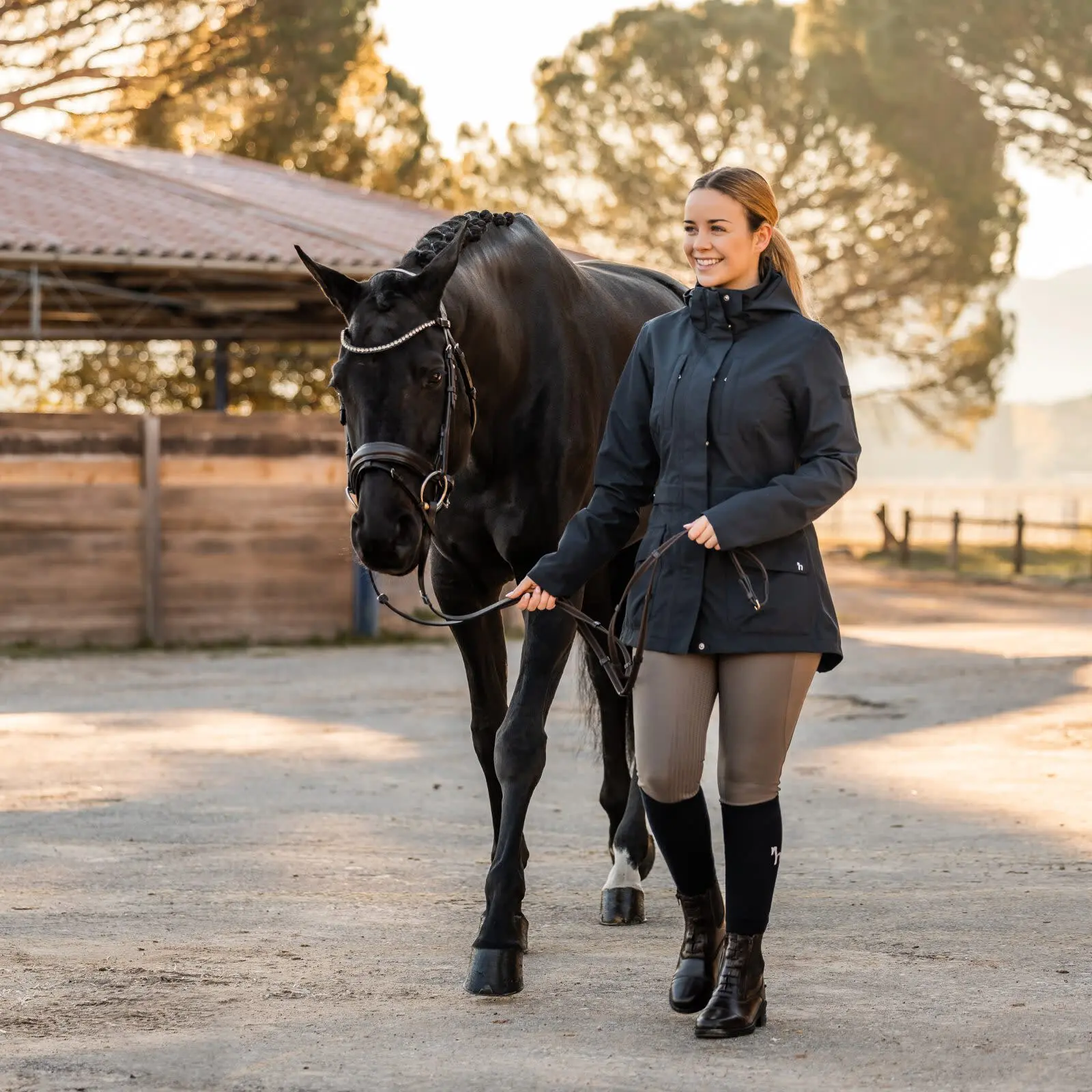 A stylish design with a tapered, fitted waist gives this women’s jacket a nice, custom look. The pockets hold everything from horse treats to car keys and cell phones. The Horze emblem on the shoulder and fine details such as press buttons and strong nylon zippers make this quality jacket durable and functional as well as beautiful. The fabric is breathable and waterproof and will protect you from warm summer showers. The back slit will help cover the saddle and allow plenty of freedom of movement. The sophisticated colors match with many items in the seasonal collection.