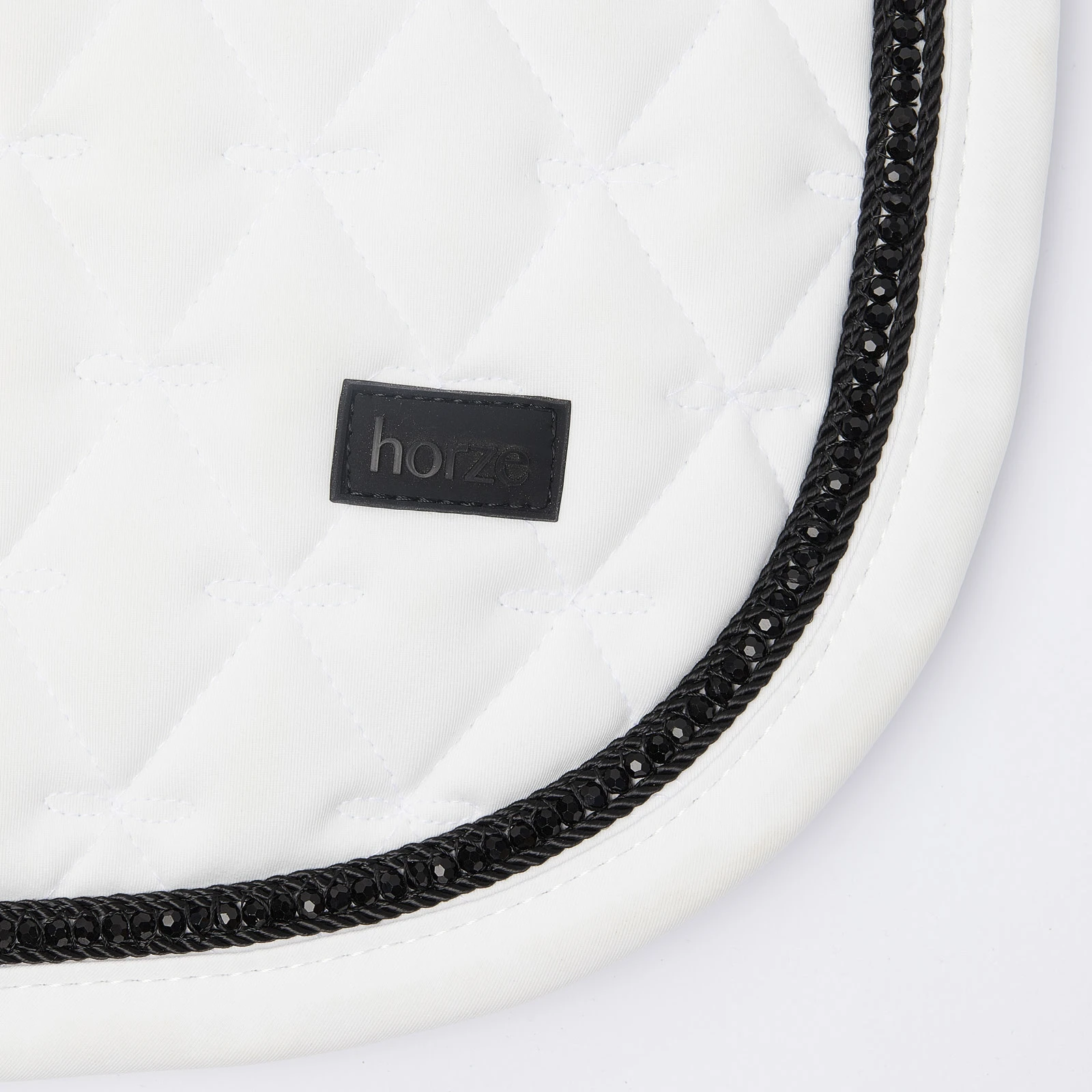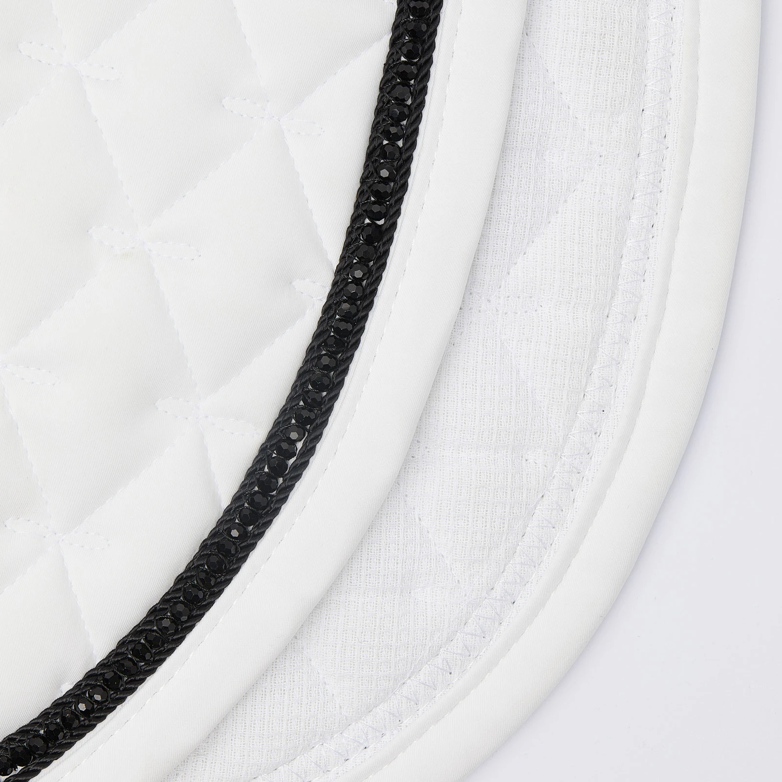 The Horze Noir saddle pad is made from soft outer material with elegant diamond quilting to relieve pressure beneath the saddle. Waffle lining wicks away any moisture, and straps attach easily to your saddle. Two rows of pretty cord and a row of shiny pearls around the edges add a touch of luxury to this saddle pad. Combine it with the rest of our Horze Noir line for a full look.