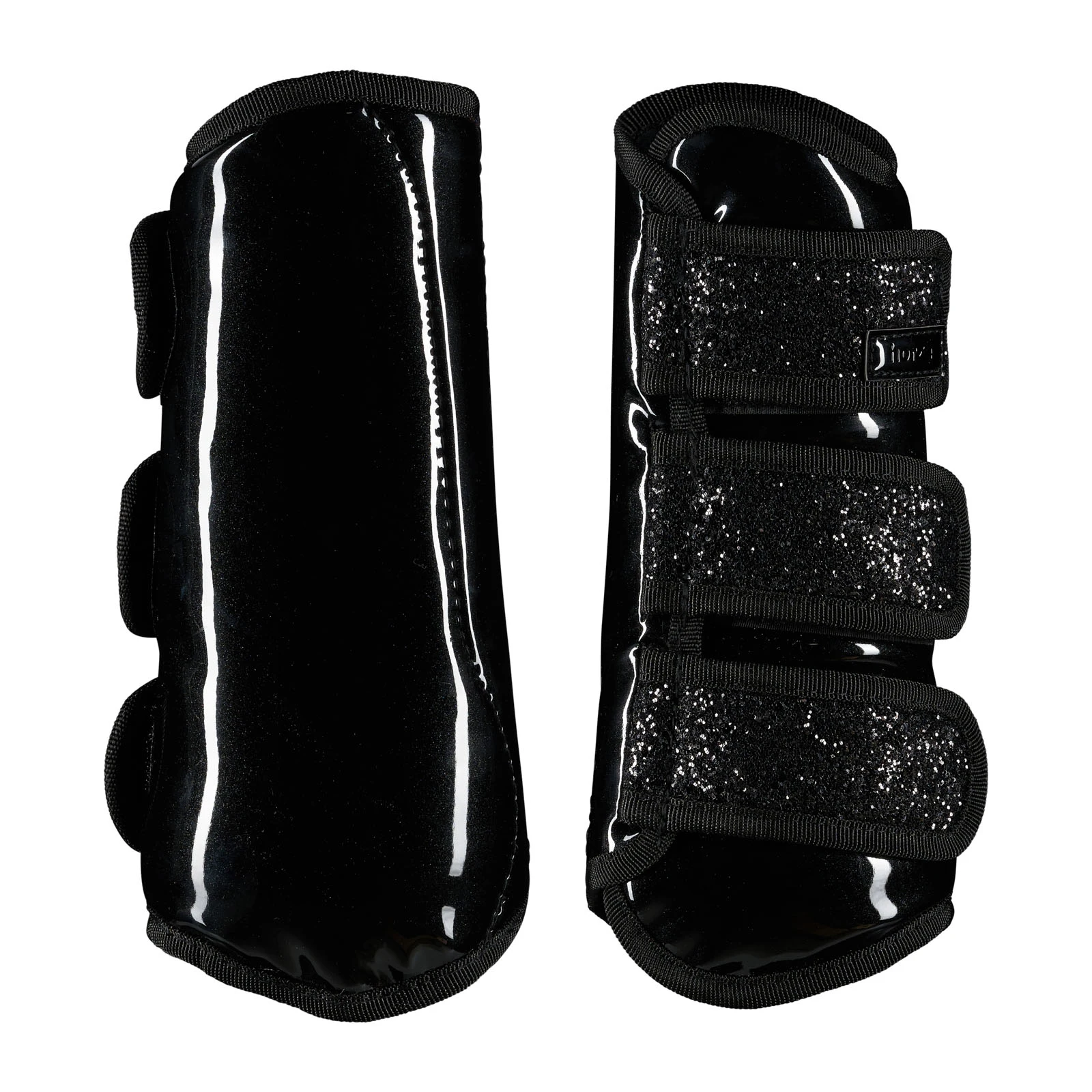 These new brushing boots protect your horse’s legs in the most stylish way. The durable outer material is long-lasting and protective, and the lining is made from breathable mesh material. Strong hook-and-loop fasteners keep the boots in place. They are coated in glitter material for a sparkly look. Pair them with the matching bell boots (#19714) for a full look.