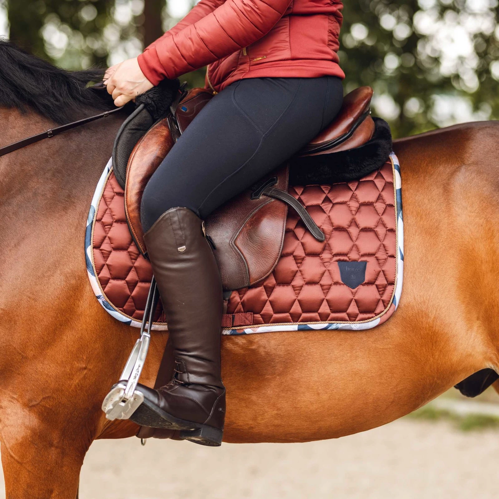 This saddle pad features a satin-like material that adds a touch of elegance to your equestrian gear. The padded saddle area is enhanced with an anti-slip silicone print, ensuring a secure and stable fit. The adjustable girth straps and long saddle attacher straps provide a customizable and secure attachment to your saddle. The quilted pattern adds a classic look, while the moisture-wicking lining helps keep your horse dry and comfortable. With contrast binding and a Horze logo badge, this saddle pad showcases attention to detail. Enhance your riding experience with the Horze Terrazzo All Purpose Saddle Pad, a must-have for any equestrian.